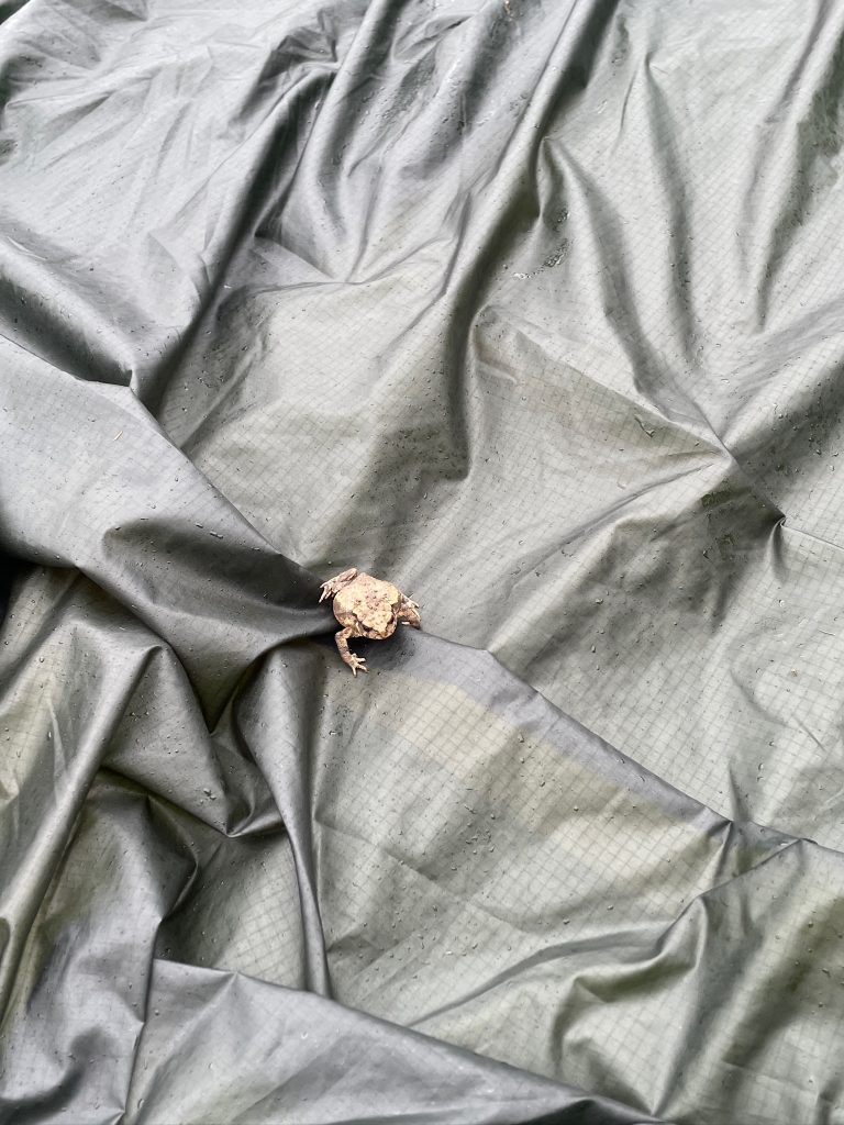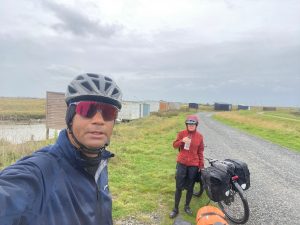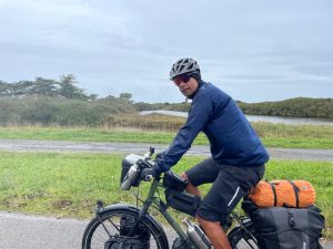 In der Nacht frischte der Wind deutlich auf und zeitweise hörte es sich an, als hätten wir unser Zelt unter einem Wasserfall aufgebaut. Die sehr erfreuliche Regenpause zum morgendlichen Zeltabbau war leider eben nur eine Pause, pünktlich zur Abfahrt durften wir uns zum ersten Mal an diesem Tag in Regenjacke, Regenhose und Überschuhe kleiden: ein weiterer Tag „Schokolade essen mit Petrus“ stand vor uns, das Spiel kennt ihr aus Kapitel 2 unseres Reiseberichts, als so wir auf dem Weg nach Norddeutschland waren, nur eben dass das an- und ausziehen aufwendiger war, weil jetzt drei Teile statt einem. Aber Poncho und Wind harmonieren nicht gut miteinander… Nach der 4. Runde hatten wir keine Lust mehr und behielten die Regenklamotten einfach an, in der Hoffnung, dass es dann nicht mehr regnen würde. Doof nur, wenn Petrus trotzig reagiert und den Hahn nochmal so richtig weit aufdreht und dann einfach extra lange offen lässt… Zur Abwechslung gab es dann anschließend überwiegend Sonne mit noch mehr Wind und Böen von bis zu 45km/h. Dabei wurde ein Vorteil von so richtig schwer beladenen Reiserädern deutlich: Sie reagieren extrem träge auf Seitenwind und so blieben wir auf der Straße bzw. konnten den Abstand zu den gewohnten eng überholenden Autos gut halten. Und im Vergleich zu einem leichten Sportrad wirkt sich Gegenwind auf die Fahrgeschwindigkeit beim schweren Reiserad auch nicht so gravierend aus, was es erträglicher macht 🤣. So war uns der heftige Gegenwind lieber als der Regen. Aber es geht natürlich auch beides gleichzeitig, wie wir noch erfahren durften. Macht dann Regen waagrecht von vorne… Wir schafften trotzdem 90km und der Atlantik war 3 Wochen nach unserem Start in Entringen nur noch 130km entfernt! Abends durften wir dann das erst mal unser Zelt mit Sturmleinen sichern und bei strömendem Regen im Zelt essen.