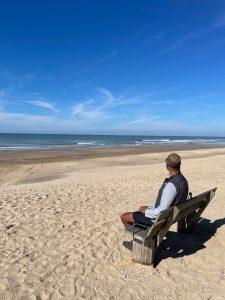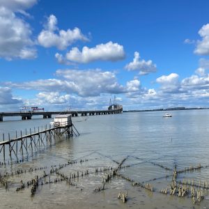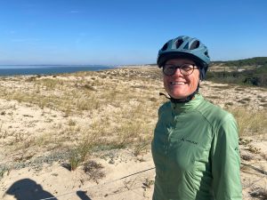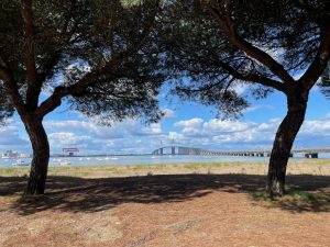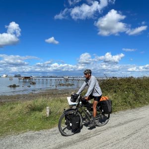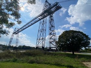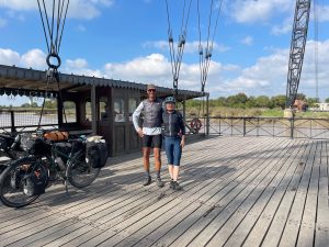 Dann endlich drei Tage Verschnaufpause! Von Les Sables d‘Olonne über la Rochelle bis nach Carcans genossen wir den gut ausgebauten Eurovelo 1 entlang der Atlantikküste. Die Stecke führte uns teils nah der Küste durch die Dünen, so dass wir bei Pausen den Blick aufs Meer genießen konnten. Überwiegend ging es aber etwas zurückversetzt durch die typischen Pinienwälder und durch bereits sehr herbstlich anmutende Laubwälder. In Rochefort fuhren wir mit der historischen Schwebefähre „Pont transbordeur de Rochefort“ über die Charente und erinnerten uns an die Fuldaquerung mit der handbetriebenen Seilbahn. Mit einer modernen, klassischen Fähre überquerten wir dann den Mündungstrichter der Gironde und erreichten das gleichnamige Departement: Wo im Sommer die Promenaden und Strände vermutlich aus allen Nähten platzen herrscht, wie auch in der Vendee bereits, jetzt im Herbst Leere und Ruhe. Die Touristenhochburgen an der Küste sind verwaist, auf dem Radweg begegnen uns hin und wieder Tagestouristen und andere Radreisende (in den Regentagen zuvor waren wir praktisch allein unterwegs), im Wasser tummeln sich ein paar Surfer in Neoprenanzügen mit ihren Boards. 300km sind es jetzt noch bis zur spanischen Grenze, vier Tage, wenn es normal läuft.