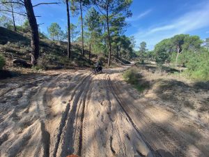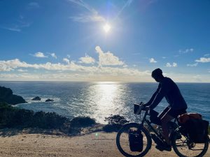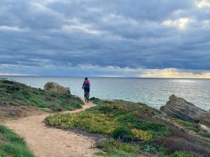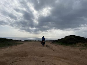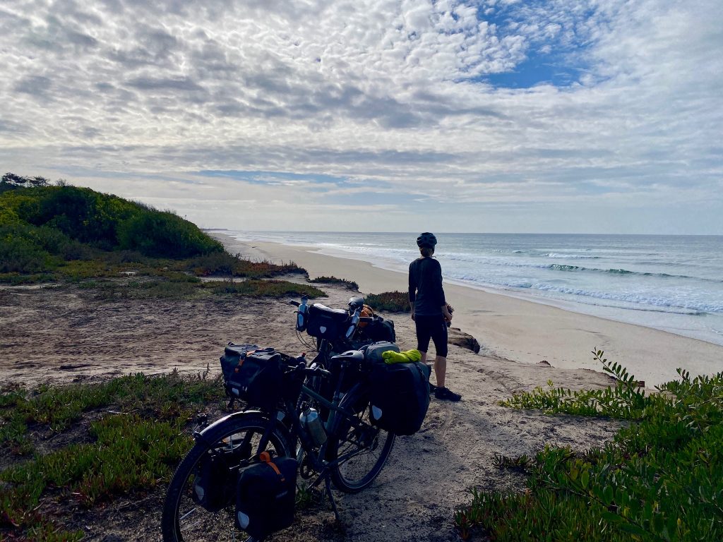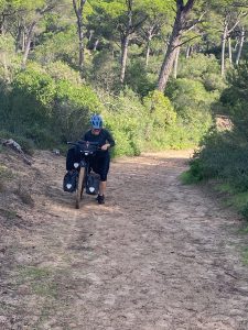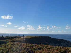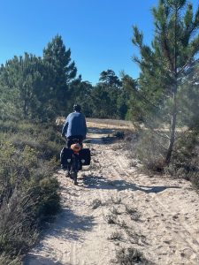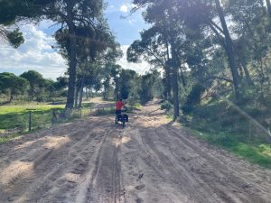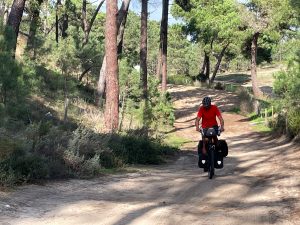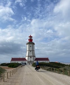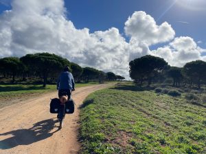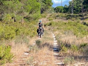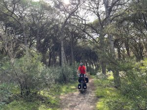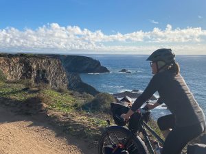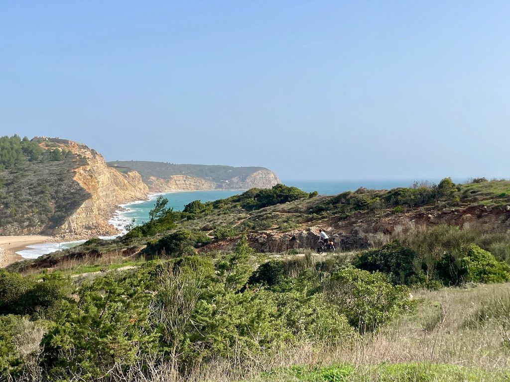Wobei das mit dem Verkehr in den letzten Tagen endlich etwas besser wurde, nachdem die Etappen von Penische bis Lissabon bzw. Setúbal doch noch sehr von zuviel Verkehr gekennzeichnet waren: Radwege sind zwar nach wie vor eher die Ausnahme als die Regel, aber die Nebenstraßen an der Küste des Alentejo, der Costa Vicentina, sind recht ruhig und seit Porto Covo fahren wir wenn möglich auf dem „Fischerweg“, dem wunderschönen Küstenwanderweg „Rota Vicentina“ oder auf parallel laufenden Schotterwegen und -straßen. Zuvor war das kaum möglich: wir sind praktisch komplett auf der Straße unterwegs gewesen, gelegentlich auch auf parallel laufenden Radwegen, aber fahrbare Schotter- und Waldwege entlang der Küste gab es praktisch nicht. Unser erster Versuch an der Westküste der Península de Setúbal (also südwestlich von Lissabon) auf dem Weg nach Sesimbra dem Verkehr zu entkommen, endete auf abenteuerlichen aber leider zu 75% unfahrbaren Sandpisten: 4km in 1,5 Stunden 😉 Entschleunigung für Fortgeschrittene. Da die Campingplatzdichte an der Küste aber etwas höher ist, war es kein Problem, dass die Etappe spontan etwas kürzer ausgefallen ist und schon die darauffolgende Etappe durch den Naturpark Arrábida zwischen Sesimbra und Sétubal war offroadtechisch ganz nach unserem Geschmack.