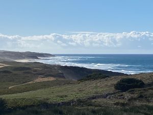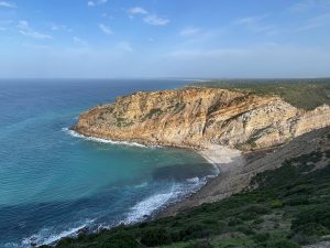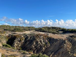 Überhaupt ist die Costa Vicentina, die felsige Steilküste der Region Alentejo, einfach atemberaubend (und deswegen entschuldigen wir uns auch nicht für die vielen Bilder). Man möchte am liebsten an jeder Bucht anhalten und von oben stundenlang das Spiel der Wellen beobachten. Und so hatten wir auch schon in Porto Covo einen Pausetag eingelegt (auf einem ebenfalls sehr guten Campingplatz) und bewegen uns generell gerade eher langsam auf die Algarve zu. Die Küste hier gefällt uns sehr, sie ist noch nicht so überlaufen wie die (südliche und östliche) Algarve, die Buchten sind oft klein und nicht immer zugänglich, es gibt weniger Strände, zu denen man runter und von da ins Wasser kommt. Der Küstenabschnitt scheint für das Surfen nicht so super geeignet, dafür lockt der Fischerweg viele Wanderer an – zu recht: der Weg auf den Klippen und durch die Dünen bietet permanent ein beeindruckendes Panorama, ist gut markiert und nicht zu anspruchsvoll aber auch nicht langweilig, soweit wir das nach den paar Kilometern, die wir gewandert sind, beurteilen können.
