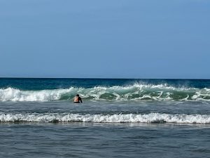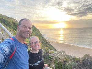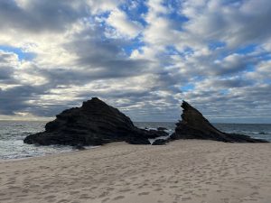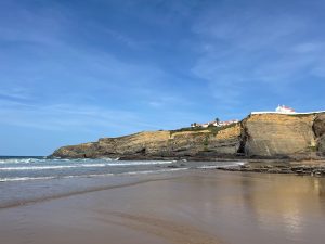 Vor drei Tagen erhielten wir ein Foto von Meikes Eltern aus dem verschneiten Freiburg und auch in Tübingen war es die Tage wohl mal weiß – kaum vorstellbar, wenn man selbst gerade seine nackten Füße in den Sand bohrt und der Wind noch die letzten Tropfen Meerwasser trocknet: an unserem gestrigen Pausetag waren wir erstmals in den Wellen! Zwar hat der Atlantik nicht gerade Badewannentemperatur und im Schatten zeigt das Thermometer um die Mittagszeit „nur“ knappe 20 Grad, aber die Sonne scheint und der Wind fühlt sich erstaunlich warm an. Der bläst heute so kräftig und mit Böen von bis zu 70 km/h, dass wir uns entschieden haben, einen weiteren Tag auf dem Campingplatz von Zambujeira do Mar dranzuhängen. Die Kombination aus den meist sehr knapp bemessenen Überholmanövern der hiesigen Automobilisten und seitlichen Windböen ist uns dann doch zu unberechenbar und gefährlich.
