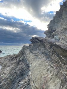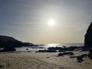 Und dann haben wir gestern nur zwei der vier schönen Buchten vor Ort erkundet und genießen jetzt Nummer drei an diesem stürmischen Tag ganz für uns alleine (gut eine Stunde nachdem diese Zeilen entstanden vertrieb uns dann aber der Sandsturm aus unserem kleinen Paradies): rund 150m Sandstrand, das Meer zu unseren Füßen, im Rücken die 30 bis 40 Meter hohen Klippen.