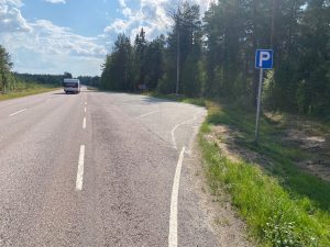 Ans Leder wollten uns außerdem die Mücken. Auf diese waren wir gedanklich ja auch vorbereitet, aber das ist eben was anderes, wie wenn man den Biestern dann 24/7 ausgeliefert ist. Solange wir auf dem Rad saßen, ging es ja noch, aber selbst die kürzeste Pinkelpause wurde sofort zum Kampf um Stich oder Tod. An gemütliche Pausen war nicht zu denken. Wobei das auf den trostlosen finnischen „Rastplätzen“ eh schwierig ist: ein „P“ an einer geteerten Parkbucht ohne Sitzgelegenheit, Mülleimer, Klo, Schatten und als „Aussicht“ Bäume rechts und links.