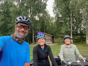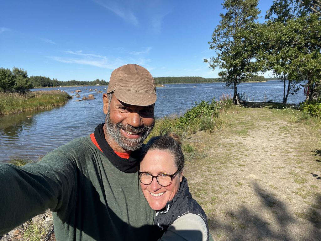 Vor dem ersten Supermarkt auf der schwedischen Seite plauderten wir mit zwei andern Radreisenden und wurden dabei sofort von einer Einheimischen gefragt, ob sie denn ein Foto von uns machen soll. Auf der Straße dann überwiegend rücksichtsvolle Autofahrer und den ein oder andern 👍. Die Häuser rechts und links mit Blumen geschmückt und weniger verschlossen, Menschen in den Gärten, die uns beim vorbeifahren zuwinkten. Beim Einkaufen wurde Meike von zwei Fast-Teenagern mit E-MTBs auf Schwedisch angesprochen – vermutlich auf ihr Rad – und erst als Meike auf Englisch entschuldigend ihre nicht Schwedischkenntnisse zugab, drehten die Burschen ab, weil sie sich anscheinend nicht trauten ihr Schulenglisch auszuprobieren. Den Platzwart von unserem Shelter vorgestern Abend sind wir fast nicht mehr losgeworden, so viel hatte der uns zu erzählen. Und überall begegnet man uns mit einem freundlichen Kopfnicken oder Lächeln. Auch die Landschaft, die immer noch arg baumlastig und unspektakulär ist, wirkt nicht mehr so abweisend. Sie ist offener, etwas abwechslungsreicher und lieblicher. Überall laden schöne Badestellen und Rastplätze zum pausieren und übernachten ein. In Finnland haben wir diese fast vergeblich gesucht.