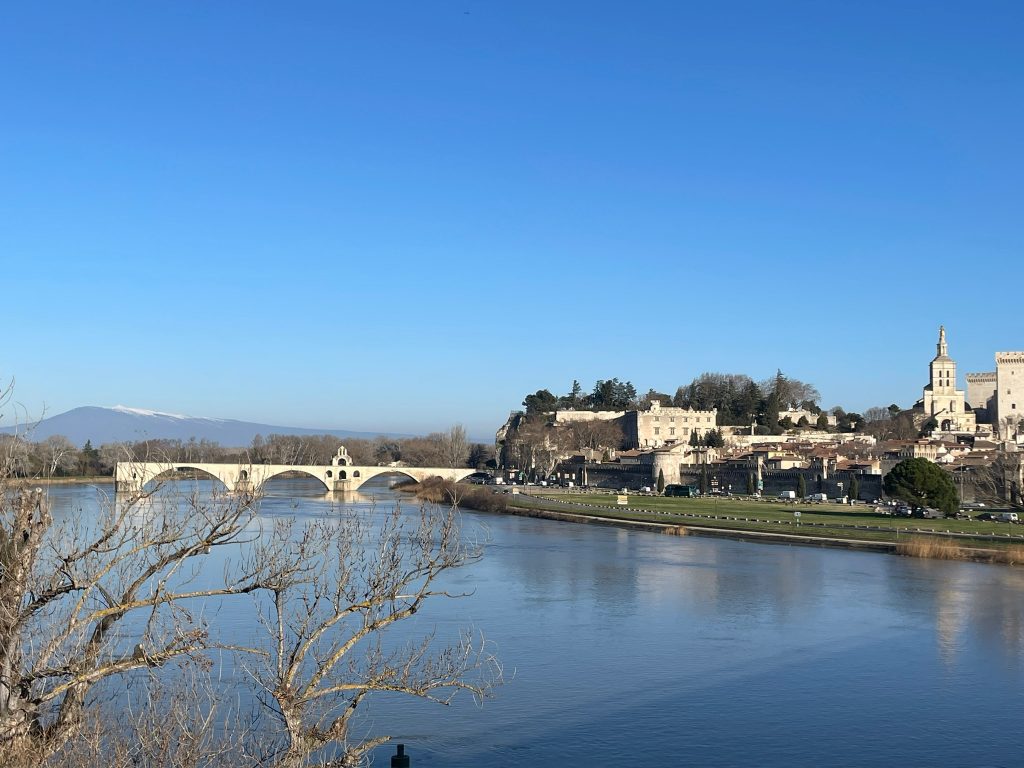 Blick auf die berühmte Brücke von Avignon, die historische Altstadt mit dem Papstpalast und im Hintergrund der unter Radfahrern legendäre Mont Ventoux.