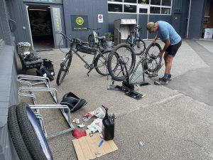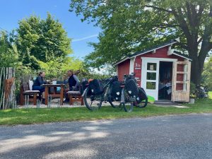 Auch ein erfahrener Fahrradhändler und versierter Mechaniker ist nicht davor gefeiht mit mäßigem oder der falschen Material unterwegs zu sein: leider hat sich unser Umstieg auf die Continental Ruban ShieldWall Faltreifen als Schlauchlos-Variante als Flopp herausgestellt. Ein größeres Loch, das sich Thomas schon in der zweiten Woche durch eine Scherbe eingefangen hat, hat sich nicht dauerhaft flicken lassen, und ungewöhnlich viele kleine Durchstiche haben unser Vertrauen in den Reifen ziemlich geschwächt, auch wenn letztere von der Milch abgedichtet wurden. Der Reifen mag am MTB gute Dienste tun, für schwer beladene Reiseräder ist er aber nicht geeignet. Deswegen bekommen unsere Räder heute neue Schlappen: Schwalbe Almotion Evolution TLE. Nicht ganz so offroad tauglich aber hoffentlich geeignet für die Strecken, die vor uns liegen. Auf dass wir ohne weitere Pannen bis zum Nordkap radeln 😉