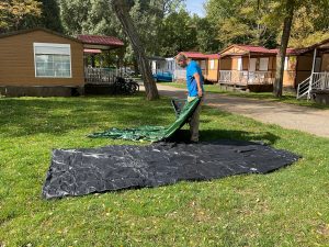 Die Schlechtwetterdefizite des Kuppelzeltes wollten wir mit dem Tarp kompensieren und uns gefiel dabei der flexible Aufbau des Tarps auch unabhängig vom Zelt als Regen-, Wind oder Sonnenschutz. Das hat in der Praxis schlechter funktioniert als gedacht, das Tarp hätte größer sein müssen, die Tarpstangen länger und dadurch wäre alles wieder schwerer geworden und windanfälliger… Außerdem hatten wir nicht damit gerechnet, dass dieser Herbst so kalt und nass werden würde…