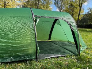 Womit wir beim besseren Wetterschutz wären: Die Crux an den Apsiden des Kuppelzeltes ist nämlich, dass es bei geöffneter Tür reinregnet, und zwar nicht nur in die Apside selbst, sondern auch auf die Tür zum Innenzelt und somit letztendlich auch ins Innenzelt, wenn man dessen Tür öffnet… Vor allem bei starkem Regen gibt es keine Chance, ins Zelt zu kommen, ohne dabei Sachen nass zu machen. Zumal man seine Regenklamotten entweder vor dem Zelt ausziehen muss und dabei nass wird oder drinnen, und dabei auch alles nass macht. Beim Tunnelzelt dient hier die Apsis quasi als Schleuse: rein in die Diele, raus aus den nassen Sachen, nasse Klamotten verstauen, trocken ins Innenzelt, und umgekehrt bequem in die Regenklamotten, bevor man das Haus verlässt.