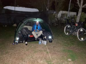 Wir hatten uns vor dem Start unserer Europareise in Sachen Zelt lange Gedanken gemacht und Thomas hat viel recherchiert. Und letztlich sind wir als jahrelang recht zufriedene und überzeugte „Kuppelzelter“ beim Allak 3 gelandet, wobei das Tempest 3 schon damals mit auf der Auswahlliste stand. Und nun hat uns also das nasskalte Herbstwetter der letzten Wochen dazu bewogen, dem Tunnelzel eine Chance zu geben. Und nach unseren ersten drei Nächten ziehen wir ein erstes positives Fazit: Das Innenzelt ist für Thomas lang genug, die mehr Breite bräuchte es nicht, ist aber auch ganz nett (und beim schmaleren Tempest 2 wäre dann die Apsis zu klein und zu niedrig für Gepäck und Sitzen). Der Auf- und Abbau braucht noch etwas Routine und wird vermutlich nie ganz so zügig gehen, wie beim Kuppelzelt, aber auch nur unwesentlich länger. Auch der „Ein-“ und „Auszug“ geht noch nicht so routiniert von Statten wie bisher und es wird noch ein paar Tage gehen, bis jede Tasche ihren Platz hat und wir uns im jetzt einzigen Eingang nicht mehr in die Quere kommen. Die bessere Wettertauglichkeit durften wir auch schon genießen mit einem Regen-Setup am zweiten Tag: Apsis vorne hochrollen, trocken sitzen und trotzdem kochen. Und am dritten Abend wussten wir bei 4-5 Grad durchaus zu schätzen, dass es in der geschlossenen Apsis dann doch ein paar Grad wärmer ist, als vor der Tür. Ok, wenn nach einer kalten Nacht ohne Wind am Morgen bei 3 Grad das Kondenswassers von der Decke im Vorzelt tropft, will man da auch nicht sitzen. Aber immerhin können wir nun wählen, wo es gemütlicher ist bzw. uns danach richten, wo es gerade mehr tropft, draußen oder drinnen ;-).