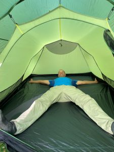 Mehr Platz bieten Tunnelzelte wie gesagt vor allem durch ihre große Apsis an der Stirnseite, die je nach Zeltgröße eben nicht nur Stau- sondern sogar Aufenthaltsraum ist. Ab einem Drei-Personen-Zelt ist die Apsis je nach Modell geräumig und auch hoch genug, um darin hocken oder gar gebückt stehen zu können oder auf niedrigen Stühlen zu sitzen. Vergleichbare 3-Personen-Kuppelzelte hingegen haben i.d.R. zwei kleine seitliche Apsiden, die gerade so viel Platz bieten, dass man seine Packtaschen und Schuhe irgendwie unterbekommt. In Sachen mehr Platz war aber nicht nur die große Apsis ein schlagendes Argument für genau dieses Tunnelzelt, sondern auch das längere (und auch breitere) Innenzelt. In unserem bisherigen Zelt stieß Thomas nämlich mit Kopf und Füßen ans Innenzelt und leider auch immer wieder ans Außenzelt, und das bedeutet bei Regen- oder Kondenswasser: Nasser Schlafsack usw.