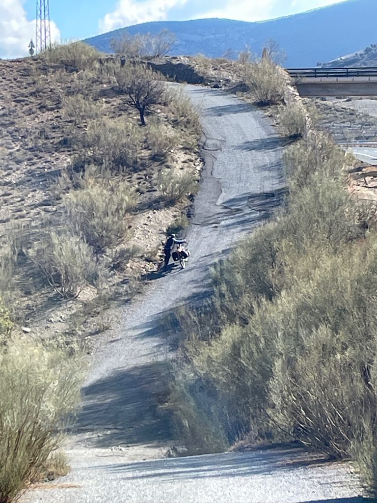 Trotz winterlicher Temperaturen kommen wir bald ins schwitzen. Man kennt das von deutschen Autobahnen: die Trasse wird mit möglichst wenig Steigungen in die hügelige Landschaft gefräst, für die parallel laufende Service-Straße sind Steigungsprozente kein Kriterium…